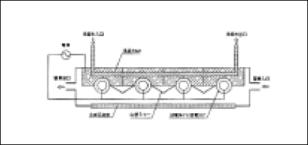 基本構造を図.3に、610mm×690mmの窓を持つ照射装置を写真.1に示す。金属ブロックに設けた複数本の溝にエキシマランプを固定する。金属ブロックは水冷できるように冷却水の流路を備えており、ランプは金属ブロックを介して水冷される。ランプとランプの間には山形のミラーが設けてあり、窓面の照度分布を均一にすると同時に、光を有効に取出す働きをしている。ランプ、金属ブロック、山形ミラーは外気と隔離するため金属容器内に収められ、容器内はエキシマ光の吸収の少ない気体(窒素)で満たされている。ランプ前面にはエキシマ光を効率良く透過する窓ガラス(合成石英)が設けてあり、窓ガラスよりエキシマ光が照射される。