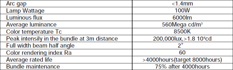 アーク長:アーク長(=電極間距離)は1994 年頃まで150W ランプで5mm、250Wランプで6mm が標準的な長さであったが、まず交流点灯形120W ランプが3mm 化された(4)。1994 年に短アーク長ランプに適した直流点灯形メタルハライドランプが開発されてからはアーク長の短縮が容易になり、250W ランプのアーク長も3mmが可能になった。最近では直流点灯形150W ランプでアーク長1.5mm(5)、250-260W ランプで2.2mm(6)、350W で3.7mm などが開発されている。