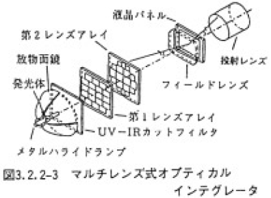 反射鏡からの光束の断面は円であるが、この光を矩形の液晶パネルに有効に当てるために小さい矩形レンズを反射鏡の前面に並べ(マルチレンズ)、各矩形レンズからの全光を第2 マルチレンズにより矩形画像パネルに当てるマルチレンズ式(=レンズアレイ式)オプチカルインテグレータ(14)が標準的に採用され始めた(15,16)。特に液晶パネル上の照度の均一性が要求される場合はオプチカルインテグレータの使用は集光率を高めるための必須条件となっている。オプチカルインテグレータには光源に色むらがある場合や、アークにちらつきがある場合でもスクリーン上での色むらやちらつきを大幅に抑制できる効果がある。図3.2.2-3 にマルチレンズ式インテグレータの構成図の例を示す。