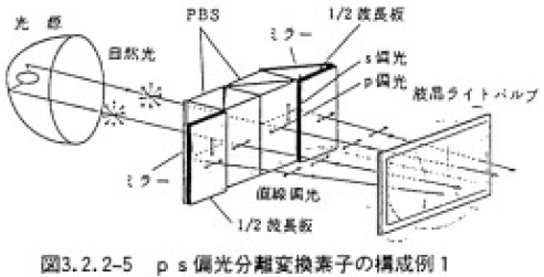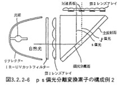 液晶パネルは電気信号により偏光角を回転させるタイプが多く、利用できる光はp 偏光かs 偏光の一方だけである。捨てられる方の光の偏光角を90 度回転し他方の偏光と混合して利用するps 偏光分離変換素子(18)が標準的に採用され始めた。ps 偏光の分離はブリュースター角に入射した光はp 偏光を100%透過す るがs 偏光の一部を反射する原理を応用したPBS(Polarized Beam Splitter)が使われる。偏光角を90 度回転させるにはプラスチックなどの複屈折物質を使う「2 分の1 波長板」が使用されている。図3.2.2-5 に代表的なps 偏光分離変換素子を示す(18)。図3.2.2-5 のps 偏光分離変換素子をそのままマルチレンズ式オプティカルインテグレータの前に置いた光学系が製品化されているが、オプティカルインテグレータの中に置く場合や、後に置いた光学系も製品化されている。図3.2.2-6 にオプティカルインテグレータの中に置いた例を示す(19)。ps 偏光分離素子に入射する光はブリュースター角から傾く先もありp 偏光成分も100%透過にはならず、同様にs 偏光も100%の利用はできないが、光源および光学系の進歩とともに光利用率の向上が期待される。
