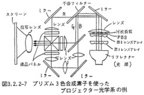 液晶パネルから投写レンズまでの距離を短縮して投射レンズの集光率をよくするためにダイクロイックフィルター付光合成プリズムが3 板式液晶用の標準的光学系として採用され始めた。図3.2.2-7 にをダイクロイックフィルター光合成プリズムを用いた全光学系の例を示す(20)。