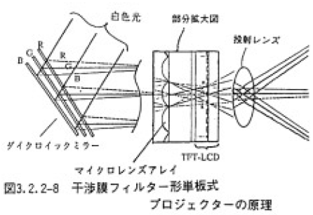 吸収フィルター形単板式液晶プロジェクターでは光利用率が3 分の1 になるためマイクロレンズ付液晶パネルによる3 色分離フィルター形単板式液晶プロジェクターが開発された(21)。3 色分離フィルターには干渉フィルター形(21)。のほか回折格子形、ホログラム形(22)などの提案がある。図3.2.2-8 に干渉フィルター形単板式液晶プロジェクターの液晶パネル照射系を示す。