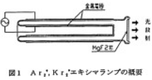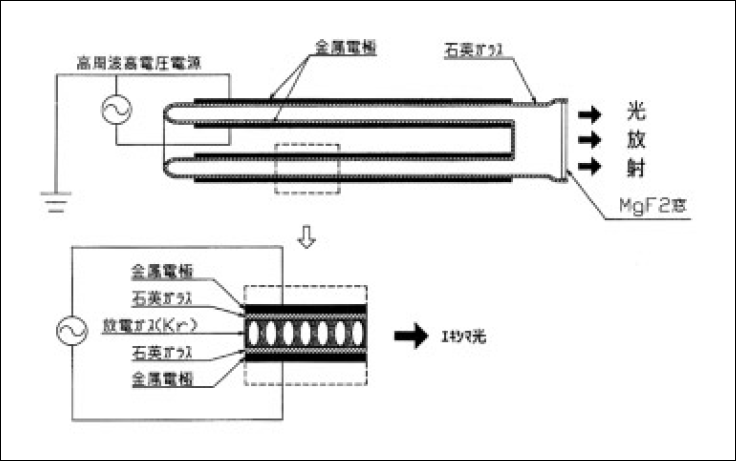 図1 にKr2*エキシマランプの概略図を示す。径の違うガラス管を同軸上に配置し、端部に光り取り出し用の窓を取り付けたものである。内部にはKr ガスを封入している。内管の内側と外管の外側に金属電極を取り付け、高周波高電圧で点灯させる。