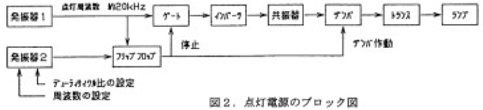 図2.に点灯電源のブロック図を示す。エキシマランプの点灯は、発振器1 の信号でゲート信号を作り、インバータを駆動させる。そして、共振器とトランスで昇圧し、ランプを点灯させる。バースト駆動は、まず発振器2で点灯と消灯のディーティサイクル比と、その周波数を決める信号を作る。そして、フリップフロップによって、発振器1 に同期した点灯停止信号をゲートとダンパに送ることで行う。バースト駆動時の消灯は、インバータを停止させると同時に、ダンパによって共振コンデンサーの電荷を急速に放電することで、ランプ電圧の振動を停止させることにより行う。