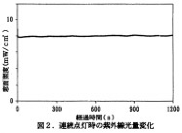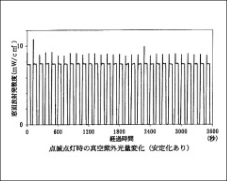 光量フィードバックにより点灯初期から温度的に安定す るまでの期間において光量変動が少なく(図2、図3)、ま たシャッタ付き光量センサで校正することによりランプが新品の状態から寿命末期に至るまでの期間 においても光量変動が少ない、そしてデューティサイクル比変調により調光制御時の配光ムラの少な いエキシマ紫外線照射装置が実現できた。