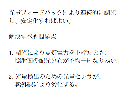 ・この課題は、光量フィードバックにより連続的に調光し、安定化すれば解決できるが、その前に解決しておくべき困難な問題点があった。
