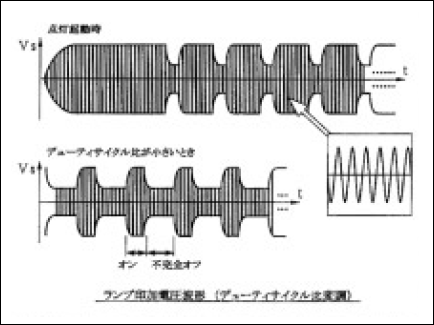 ・このように、点灯電力を下げるときに、ランプオンの期間を短くする方法を、ここでは、デューテイサイクル比変調と呼んでいる。