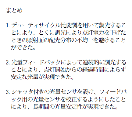 ・第1の問題点については、調光に際しては、デューテイサイクル比変調を用いることにより、照射面の配光分布の不均一を避けるという方法。