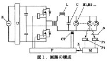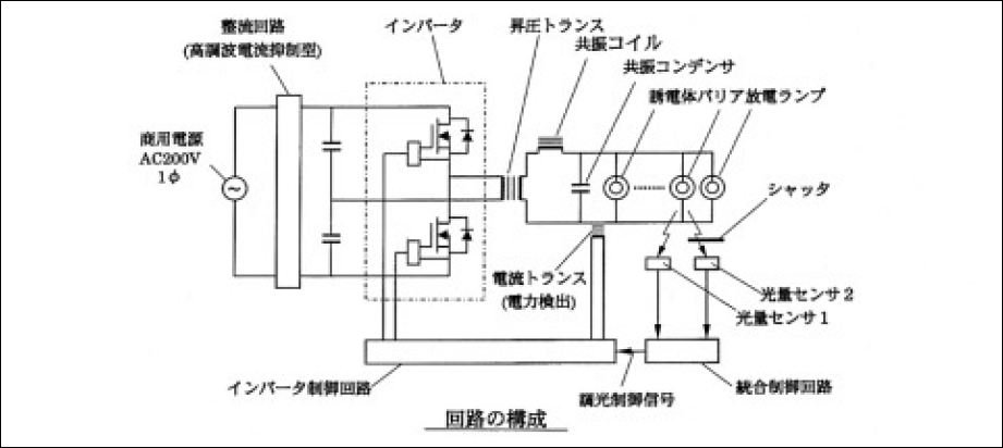図1 に回路の構成を示す。有効発光長700mm のXe2*(波長172nm)エキシマランプ13 本を並列に接統し、定格総合ランプ投入電力を1.8kW とした。電流トランスCT により検出されるランプ電流を、インバータ制御回路F がフィードバック制御することにより、ランプ投入電力は精密に安定化される。光照射面の大きさは650×780mm である。今回は、光量センサP1 の検出信号に基づき、統合制御回路Mがインバータ制御回路に対して調光制御を行うことにより、紫外線光量を安定化した。調光制御は、ランプ投入電力をデューティサイクル比変調することにより行った。また、紫外線による光量センサの感度劣化による不正確を排除するために、シャッタS を備えた標準の光量センサP2 をさらに設け、これにより定期的、自動的に校正動作を行えるようにした。