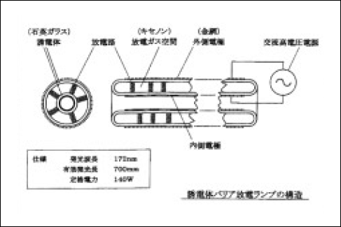 ・封入ガスは、キセノンで、波長172nmの真空紫外エキシマ光が、外管から放射される。