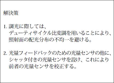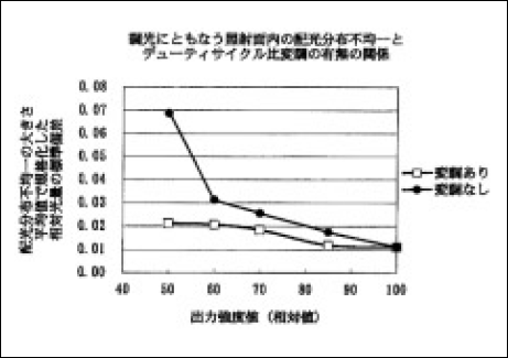 ・第1の問題点については、調光に際しては、デューテイサイクル比変調を用いることにより、照射面の配光分布の不均一を避けるという方法。