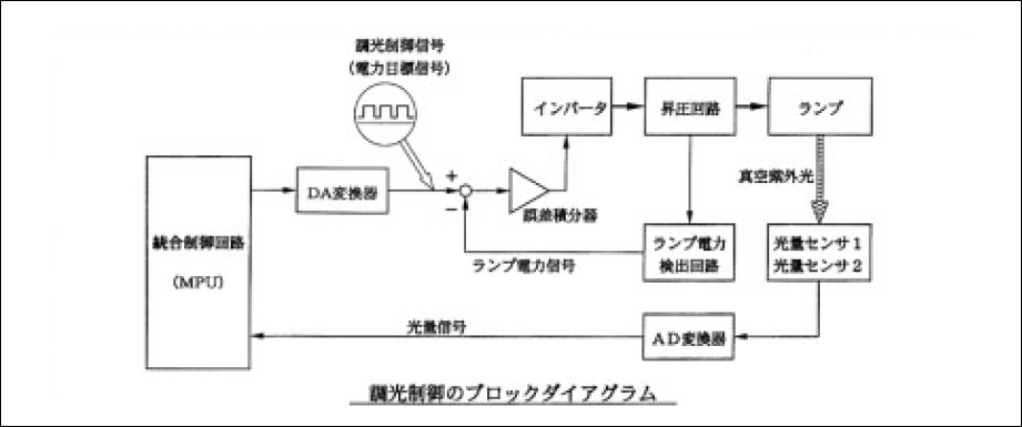 光量フィードバックにより点灯初期から温度的に安定す るまでの期間において光量変動が少なく(図2、図3)、ま たシャッタ付き光量センサで校正することによりランプが新品の状態から寿命末期に至るまでの期間 においても光量変動が少ない、そしてデューティサイクル比変調により調光制御時の配光ムラの少な いエキシマ紫外線照射装置が実現できた。