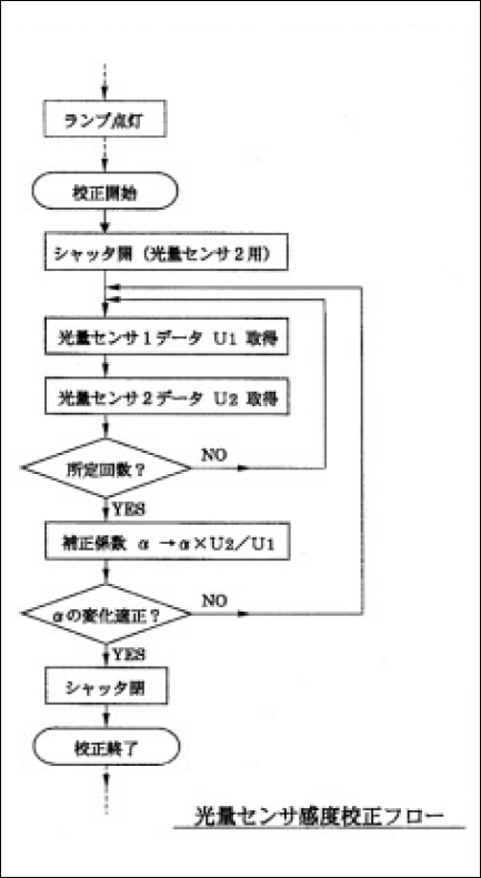 ・ランプの点灯中に、光量センサ2を保護しているシャッタを開き、光量センサ1および2の検出信号を取込み、光量センサ1の感度補正係数を更新する。