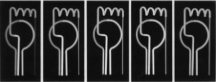 水銀―ネオン混合気体をパルス放電させると、発光色を水銀の青白色からネオンの赤色の近くまで、連続的に変えることも可能です。また放電ランプの内壁に蛍光体を塗布しておくことによって、変色する気体の放電発光色に、蛍光体の発光色が加わり、気体のみの発光色とは異なる色相で変色することができます。蛍光体を塗布した部分は、透明部分の水銀とネオンの発光色とは異なる色相で変色します。この方法を使用すれば、1個のランプで色の違うネオンサインをつくることが可能となります(図1)。またこの可変色放電の原理をそのまま、蛍光体を励起する紫外放射の分光分布の制御に応用できます。そして同研究室では、以上の研究結果を踏まえて、蛍光ランプの色を変えるため、次 のような研究を行いました。