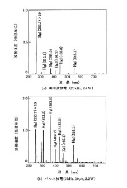 高周波放電では200~800nmの範囲では水銀のスペクトルのみ253.7nmが最も強い。パルス放電ではキセノンのスペクトルが多数放射するし、水銀の高準位の365nmなどが強くなる。ただし253.7nmの強度は10分の1に縮小してある。