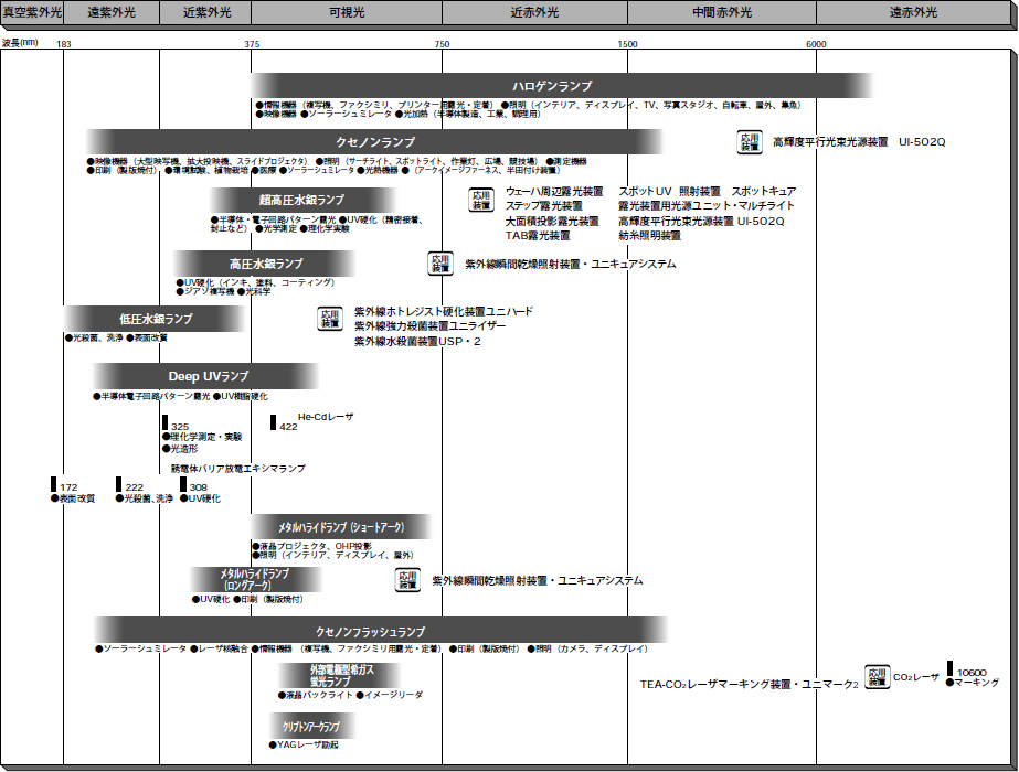 光の技術はエレクトロニクス、メカトロニクス、ケミカル、バイオ、コミュニケーションなど数多くの分野で、最先端テクノロジーをサポートしてきました。ウシオは創立以来、光の専門企業として、光の創生と応用開発を続け、多くの製品群を生み出してきました。光の主役はあかりであった時代から、光がエネルギーとして利用される時代へと移りつつあります。光は電磁波の一種ですが、ウシオの係わってきた光源との関係を示すと図1-1のようです。産業分野の光はますますエネルギーとしての質が求められていることがわかります。