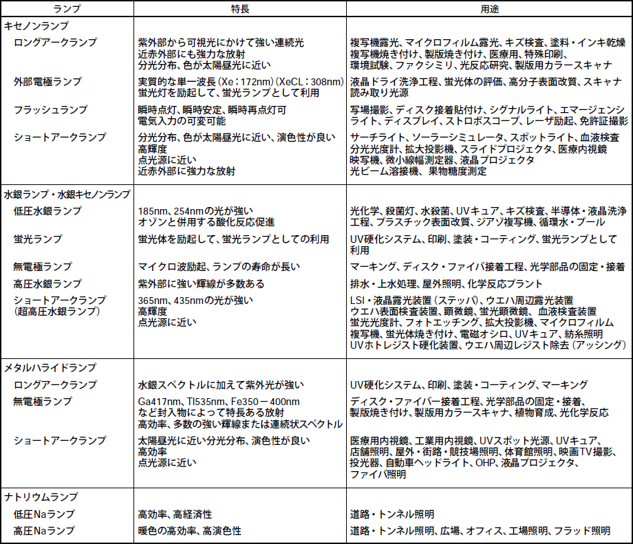 ショートアークランプにおいては、二つの近接した陰極と陽極によって支持されたアーク放電から強烈な光が放射される。従って、その特徴は高い放射輝度であり、これから疑似点光源としてレンズやミラー、ファイバなどの光学デバイスと組み合わせることによって光の集中、拡散、屈折、回折などが自由にコントロールできる光源という特徴が出てくる。さまざまな用途の要求に応じている。実際の用途に使われている基本的なランプは封入物で分けると、超高圧水銀ランプ、キセノンランプ、メタルハライドランプおよびナトリウムランプの4つである。それらのうち前3者について解説するのがこの特集の主題である。この節ではこれらのランプの特徴と用途について表1をかかげ、簡単に説明する。