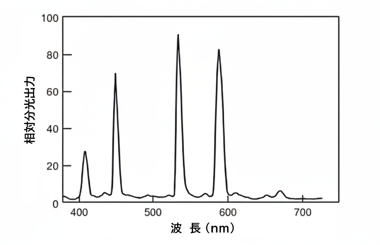 約30年前のメタルハライドランプの開発の初期に①の少数スペクトルの組合せによる白色高効率光源が開発され、続いて②が開発された。さらに金属ハロゲン化物の分子発光を利用した高演色性の光源として③が開発された。②の組合せや更に演色性を高めるため沃化ナトリウムを添加したタイプの70W―1kWランプが標準的なメタルハライドランプとして多く生産されている。