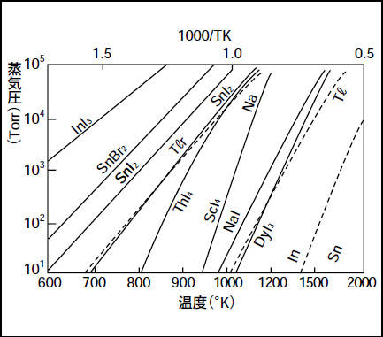 (2)比較的高い蒸気圧を持つ金属もあるが、そのような金属は石英ガラスを侵す場合が多い。金属単体では石英ガラスを浸食する金属でもハロゲン化物にすると石英ガラスを浸食しなくなるため、この効果を利用する。この代表的な例がナトリウムなどのアルカリ金属である。