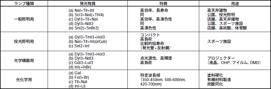 表4-1にメタルハライドランプの種類と用途をまとめる。