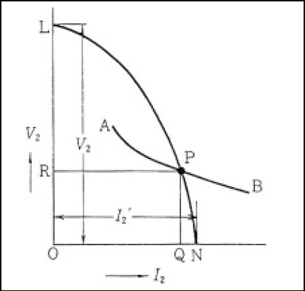 磁気回路式安定器を使った時動作特性は、図4-18 1)の道程で示すことができる。曲線LNが磁気漏れ変圧器の二次側の電流―電圧特性、曲線ABが放電ランプの電流―電圧特性とすると、点Pが動作点となるように、点灯中の電流は曲線OQ、電圧は直線ORのように変化する。