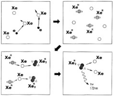 発生した放電プラズマ中では高エネルギーの電子によって放電ガスの原子が励起されて、瞬間的にエキシマ状態(Ar2*、Kr2*、Xe2*、KrCI2*、XeCI2*)となっている。このエキスマ状態が基底状態に戻るときに、そのエキシマ特有のスペクトルを発光(エキシマ発光)する。発光スペクトルは、充填された放電ガスの組成によって決まる。発光波長は実質的に単一波長に近く、半値幅は数nm~+数nm程度である。エキシマ発光の原理をXe2*図5-4に示す2)。