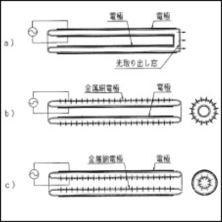 図5-6bに構造を示す。太い石英ガラス管と細い石英ガラス管を用いて円筒状の放電空間を形成している。太い石英管の外側には金網を、細い石英管の内側には光反射板をかねた金属箔を配置し電極としている。金網を通して光を取り出す。このタイプのランプを複数本配置することで大面積の平面光源を作ることが出来る(後述)。