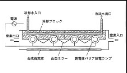 ランプを複数本組込んだ平面光源の基本構造を図5-7で説明する。ランプは水冷されている冷却ブロックに4本取り付けられ、並列点灯される。ランプとランプの間には光出力の分布を均一にする為の山形ミラーが取り付けられている。ランプ前面には光を取出すための石英ガラス窓が配置されていて、ランプハウス内部は窒素でパージされている。原理的にはこのような構成で幾らでも大きい面積の平面光源を作ることが出来る。