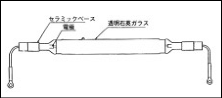 基本構造は、水銀ランプに類似しており、放電管には透明石英ガラスを用い、電極にはトリエーテッドタングステンを用いている。外観は図5-9に示すとおりである。水銀ランプとの若干の違いがあり、それは放電管内に電気を送り込む電極とモリブデン箔から成るマウント部に集中している。その一例として、マウント部の電極と箔の溶接部に用いるバインダーの材質が異なる点があげられる。この点が設計上のポイントである。