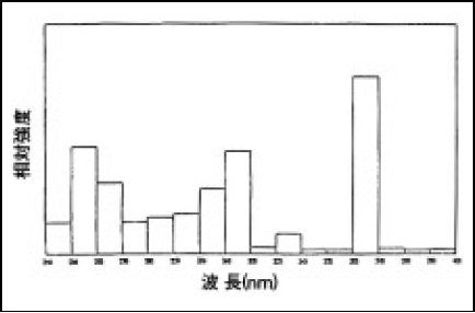 一例として、一般的によく使用されている鉄系ロングアークメタハラ(鉄の放射が強い)では、350~400nmの鉄の連続放射により、この紫外領域の放射出力は水銀ランプの2.5倍以上になる。水銀ランプと鉄系メタハラランプの分光分布図をそれぞれ図5-10と5-11に比較して示す。