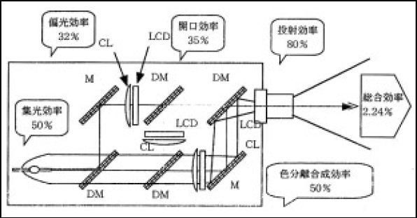 DMは色分離合成のためのダイクロイックミラーMは全反射ミラーCLはコンデンサレンズLCDは液晶ライトバルブである