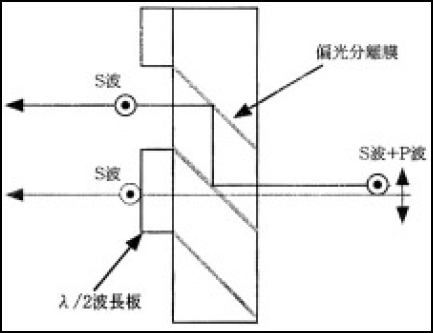 P波:入射面(紙面)と平行方向の偏光 S波:入射面と垂直方向の偏光偏光分離膜ではS波のみが反射され、透過したP波はλ/2波長板に入射し、振動方向を90°まわすことでS波となり、有効に利用されることになる。