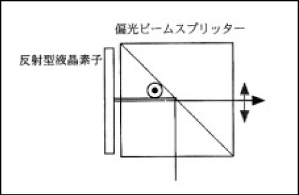反射型液晶を採用したプロジェクタはパイオニア(株)から1996年にはじめてDRI(素子5)としてXGAの解像度と92%の開口率で発表された。1997年後半から1998年にかけて相次いでIBMからもXGA素子が、日本ビクター(株)からはデジタル放送規格を意識したSXGAの開口率93%のD-ILA(Image Light Amplifier)が発表された6)。動作原理を図5-6に示す。ビームスプリッタで選択されたS波は全白の場合液晶部でP波となって投射レンズに導かれ、全黒の場合はビームスプリッタにより光源にもどることになる。このユニットが図2の液晶素子のかわりに配置されることでカラーのプロジェクタを構成する7)。いずれも透過型と比較して開口率が高く、画素間に非発光部が少ないため画面が明るく画質が向上する。といったメリットや素子の背面を直接冷却できるので素子への入力光東を高くできる可能性がある。その半面素子と色合成クロスプリズムの間にガラスプリズムを3個もたなくてはならないためにコストアップや重量増そしてプロジェクタレンズのバックフォーカスが長くなるため同じ明るさの投射レンズにするためにはレンズが大型化すると言ったデメリットが考えられる。