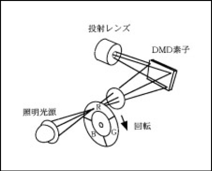 回転するフィルターで各色のときに相当画像情報でDMD素子を駆動することでカラー表示となる