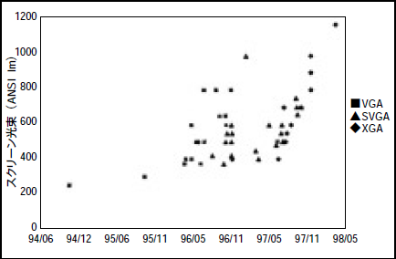 プロジェクタの性能は年々着実に明るさと解像度を向上させてきた。図6-11に新聞発表されてきた時期とカタログ上のスクリーン光束をプロットしたものを示す。そこにはこれまで述べてきたような光学系の改善や新しい素子の提案などによって可能になってきたわけであるが、一方で光学系が要求する光源の小型化がこれを可能にしてきたともいえる。