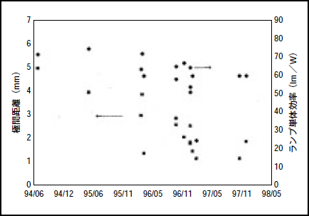 これまで述べてきたようにプロジェクタの進歩には光源の進歩が必要不可欠であった。光源に求められた特性は大きくは発光効率、演色性、光源サイズ、維持寿命である。発光効率や演色性に関わる改善についてはここでは詳しく触れないが、希土類をベースにした発光が多く用いられた。初期のランブはAC点灯が主流であったが、1995年にDC点灯方式が提案され、従来1000時間に満たない寿命特性だったものが2000時間をこえて利用できるようになった。さらに1996年には水銀のみの超高圧での発光を利用した光源が提案され2000時間をこえた寿命も可能となってきた。図6-12に図6-11に相当する期間に主流だった光源のアーク長と発光効率の変化を示す。図からも解るように初期5mm程度の光源長でスタートしたメタルハライドランブは今日では1.3mmまで短くなってきた。短アーク化と同時に超高圧下での水銀灯は図6-13に示すように輝度分布の広がりも小さくなり実質的な光源サイズの小型化が進み、素子の小型化や新しい利用効率の向上をめざした光学系の改善と相まって、光の利用効率が飛躍的に改善してきたと考えることができる。一方キセノンランプは本来その発光効率があまり高くないが、短極間化したときに比較的大出力化が可能であることや、超高圧の水銀灯では不足気味の赤の連続発光が大きいために色再現性を重視した一部のプロジェクタで採用する動きもある。