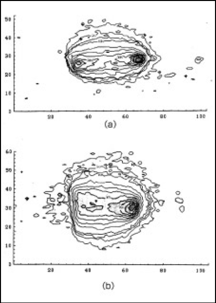 図6-13 極間が1.4mmの超高圧水銀ランプ(a)とメタルハライドランプ(b)の輝度分布の比較