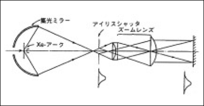 サーチラィトの光学系はパラボラミラーとキセノンショートアークランプの組合せからなっており、ミラーの焦点とランプのア一ク位置の関係を調整することで、拡散、平行、集光の状態の光ビームをつくりだせる。