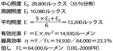 光学系の効率としては例えばXe-2kW、でみるとキセノンショートアークランプ(UXL-2000PR)は全光束64,000ルーメンであり、有効光束は14930ルーメン、計算によって23.3%の器具効率となる。