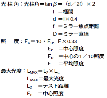 サーチライトはどれ位の平行度合なのか、またどれ位の明るさなのかは計算で求めることができる。平行度合は光柱角で表わし光ビームの明るさは最大光度で表示される。