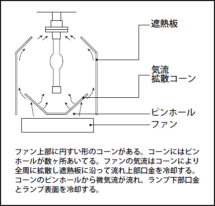 ランプの表面温度が過冷却にならずに上・下口金部を冷却しなければならない。そのため、この灯具では、強空冷ファンに若干の工夫がしてある。