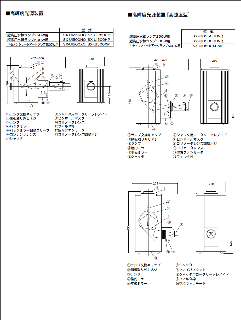 • ④構造上のレイアウトとしては、レンズによる集光系も楕円ミラーによる集光系も、灯具の高さ寸法を変更するだけで、横幅、奥行共に同寸法で製作が可能のため、灯具のシステム性が向上している。