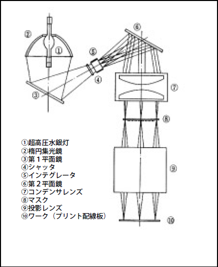 ①従来のプリント配線板に使用される露光方式は、発散光による密着露光、あるいは平行光によるプロキシミティ露光であった。これら従来の露光方式では、マスクにレジストなどの異物が付着し、プリント配線板のパターン欠損による歩留り低下が問題となっていた。ところが、投影露光方式では、マスクとワーク(プリント配線板)が、投影レンズを介し完全に分離されているため(図7-3)、前述のパターン欠損は皆無となる。
