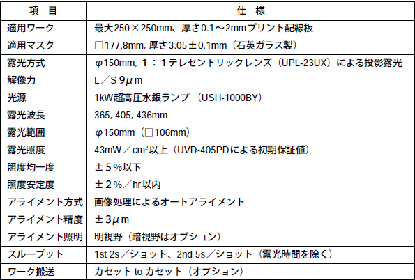 • ①有効露光範囲Φ150mm、解像力9µm、倍率1:1のテレセントリックレンズを使用している。