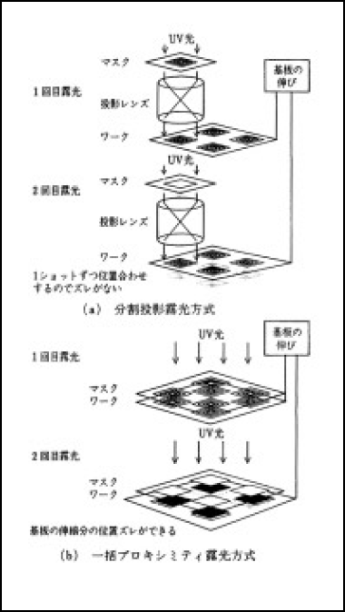 また、密着露光方式あるいはプロキシミティ露光方式では、パターン欠損を回避するため、ひんぱんにマスクの洗浄が必要になり、生産性低下、マスクダメージによるランニングコストの上昇が問題であった。投影露光方式では、マスク洗浄は不要となり、マスクは半永久的に使用可能となる。これは、ビルドアップ基板に求められるファインパターンで、高価な石英マスクを使用できることを意味している。