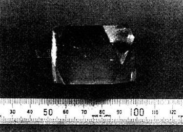育成の初期にシード回転を30r.p.m.(3分毎に反転)で結晶を育成し、育成5日後、回転数を25r.p.m.に低下させた。育成終了後の結晶を図1に示す。回転数を低下させた時期に対応して、多結晶化している。この場合においてシード方位は特定しなかったので、〈100〉軸シードを用い、シード回転数60r.p.m.で育成した結晶を図2に示す。育成日数14.5日間でa×b×c=45×41×44mm3の大きさの結晶が得られた。図より、インクルージョンやクラックがないことがわかる。以上のことから、シード回転数の増加により溶液の撹拌が十分に行われ、原子の配置がスムーズに行われた結果、大型の単結晶が得られたと推察できる。また今回の条件下において、シード回転数25r.p.m.から30r.p.m.の間に高品質化に必要とされる回転数の境界があると推測できる。