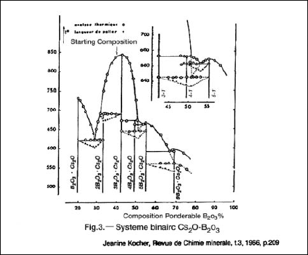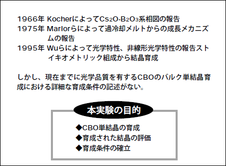 CBOはコングルエントメルトする材料であるが[3]、結晶育成の容易さからセルフフラックス法を用いた。B2O3リッチの組成は粘性が高くなるので、フラックスとしてCs2Oリッチの組成を選択した。出発組成は、示差熱分析によりCBOの融点より3°C低いB2O3/Cs2O3=1/2.75とした。原料として、Cs2O3、B2O3(いずれも3N)を用いた。結晶育成装置として、均一な炉内温度分布を得るため、5層抵抗加熱炉を用いた。坩堝は白金製で、100mmΦ×100mmの大きさとした。成長時の温度降下速度を約0.1°C/dayとし、シード回転数を変化させて育成を行った。結晶の均一性を調べるために、脈理検査とHe-Neレーザーによる干渉波面を測定した。