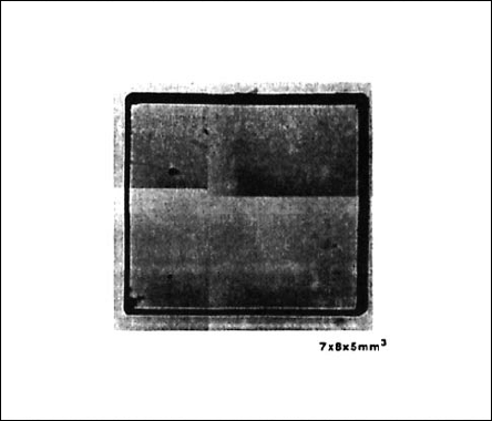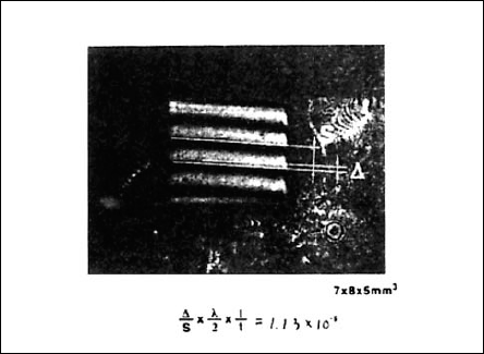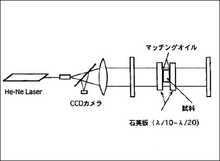 シード回転数60r.p.m.で育成した結晶の屈折率均一性を調べるために、脈理検査を行った。脈理検査は以下のようにして行われる。サンプルに白色平行光を入射すると、屈折率異常の部分で入射光が屈折し、スクリーンに到達せず、結果として、屈折率異常が像の暗部として検出される。図3は8×7×5mm3のサンプルの脈理検査結果を示す。今回スクリーンの代わりに5×5mm3のCCDを用いたため、4枚の写真を張り合わせている。像に明瞭な陰影がないことから、脈理などのマクロな不均一性がないことがわかる。さらに屈折率均一性を調べるために、He-Neレーザーを光源としたフィゾー干渉計を用いて透過波面測定を行った。これは屈折率異常があると光路長が変わるため、異常のある部分で干渉パターンが変化することを利用している。図4に透過波面の干渉パターンを示す。干渉パターンが均一であることから、屈折率が均一であることがわかる。