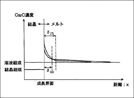 CBOはコングルエントメルトする材料であるが[3]、結晶育成の容易さからセルフフラックス法を用いた。B2O3リッチの組成は粘性が高くなるので、フラックスとしてCs2Oリッチの組成を選択した。出発組成は、示差熱分析によりCBOの融点より3°C低いB2O3/Cs2O3=1/2.75とした。原料として、Cs2O3、B2O3(いずれも3N)を用いた。結晶育成装置として、均一な炉内温度分布を得るため、5層抵抗加熱炉を用いた。坩堝は白金製で、100mmΦ×100mmの大きさとした。成長時の温度降下速度を約0.1°C/dayとし、シード回転数を変化させて育成を行った。結晶の均一性を調べるために、脈理検査とHe-Neレーザーによる干渉波面を測定した。