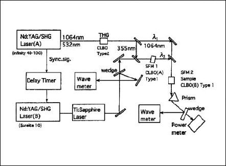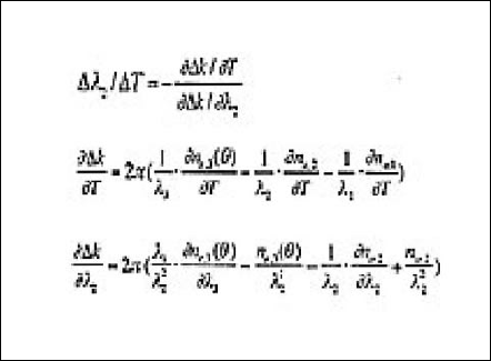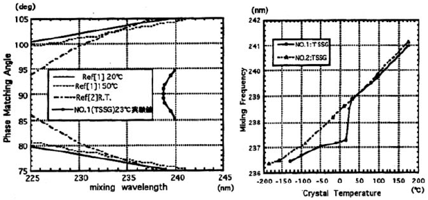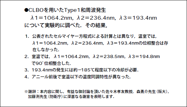 公表されているCLBOのセルマイヤー方程式[1],[2]を用いるとNd:YAGレーザーの 基本波波長(1064.21nm)と236.4nm光との和周波混合によっておよそθ=76°で位相整合し,ArFレーザと同一の波長の193.4nm光が発生できると計算されるにもかかわらず,上記2波長の組合せでは,図1に示すように室温で全く位相整合しないことを実験的に確認した.実験にはTSSG法で育成されたを用いたNd:YAGレーザの基本波波長を固定し,もう一方の波長を変えた実験によって室温(23°)では1064.21nmと238.8nmとのSFMにより195.0nm発生でnon-critical位相整合することがわかった。また,CLBOの結晶温度を変えた実験では,NCPMによってArFエキシマーレーザ波長に対応する193.39nm光を発生するには,CLBO温度を約-185°Cに冷却する必要があることを見出した(図2)。また,上記公表されたセルマイヤー方程式とdn/dTから計算されたtuning rate dλ/dTは実験的に得られたtuning rateと大きく異なった。さらに,結晶温度0°C付近でtuning rateが大きく変化する試料も存在することが実験的に確認できたが,現在,この原因はあきらかではない.
